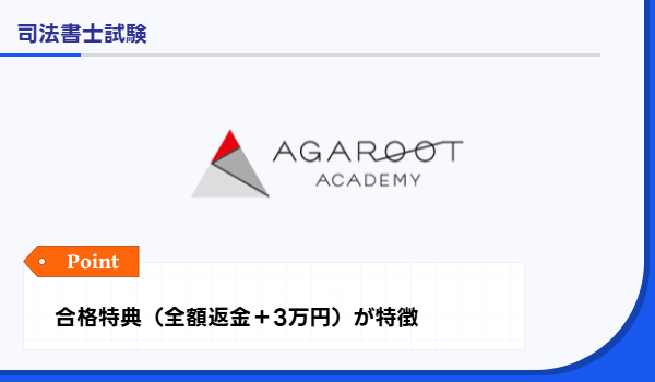 アガルート | フルカラー教材とオンライン完結 | 【2027年(令和9年度)合格目標】 入門カリキュラム/フル 349,800円 ライト 239,800円 | 令和6年度の合格実績は全国平均の約4倍の21.9% | オンライン受講相談 公式学習アプリ 定期カウンセリング | 合格で受講料全額返金+お祝い金3万円 | 通信 |