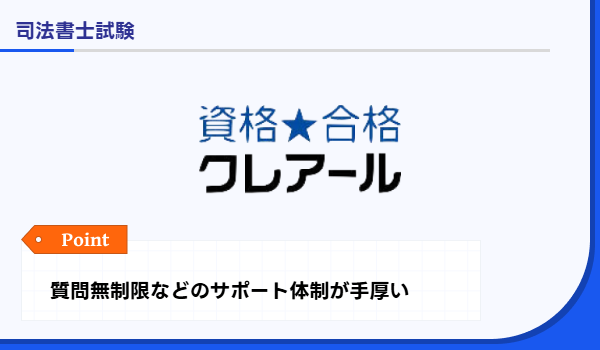 クレアール | 質問回数無制限・答案添削など伴走が手厚い | 2026年合格目標合格ルート1年スタンダード春コース 189,000円 | 具体的数値は非公表 | 質問無制限(専用フォーム/メール等) 答案は原則採点返却 | 合格お祝い金・受験料負担・未受講分返金などの | 通信 |