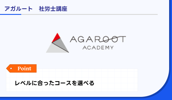 アガルートの社労士講座は社労士に必要な「改正対応」「白書・統計」「選択式対策」まで射程に入れ、初学者から経験者まで段階別に用意された講座を選べることが強みです。