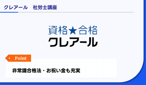 クレアール | 社会保険労務士上級スタンダードコース 社会保険労務士上級パーフェクトコース 社労士 一発ストレート合格パーフェクトコース 社労士 中・上級W受講コース 社労士 中級パーフェクトコース 社労士スピードマスターコース |