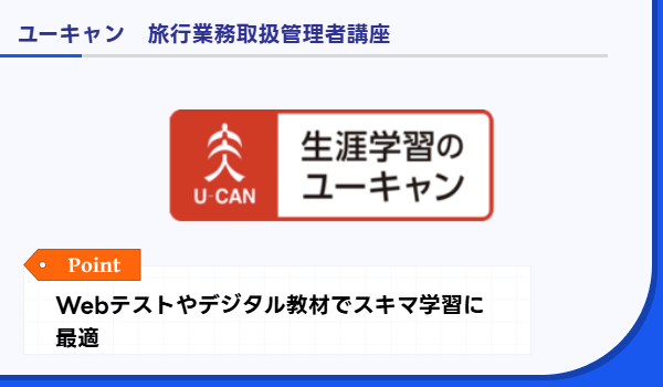 ユーキャンは過去、国内旅行業務取扱管理者資格取得の際お世話になった。体系的に学べた記憶がある。