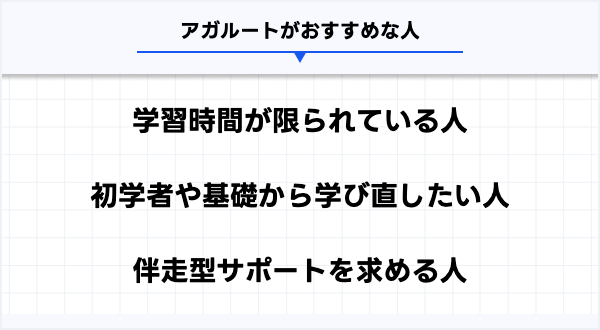 独学では難しい学習計画の立て方や疑問解消のサポートも整っているため、ゼロから体系的に学びたい方や基礎固めを重視する経験者におすすめできます。