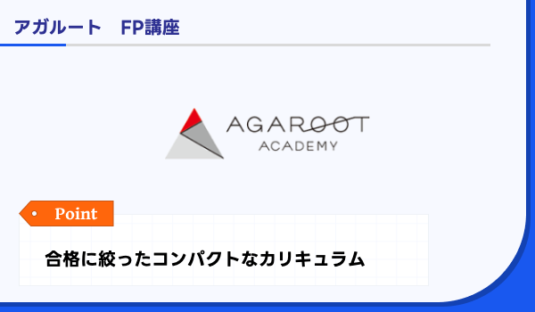 アガルート | 約33時間に凝縮した2級向け講義 | フル:76,780円 ライト:49,280円 | FP2級合格率91.67%(2024年5月試験) | 質問20回(フル)等/原則24時間以内回答 | 合格全額返金or1万円/各種割引 | 通信 |