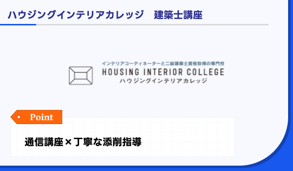 ハウジングインテリアカレッジ | 低価格なのにサポート体制充実 | 設計・製図合格通信講座:121,000 円 | 合格率 65.5% (2024年度) | 動画配信システム・オンライン教材・添削課題や質問サポートなど | 割引・早期申込キャンペーンなど | 通信・通学 |