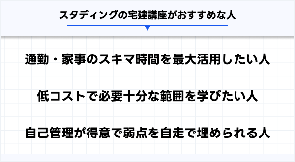 スタディングは、費用を抑えつつ要点学習で合格点を狙う“効率派”に向いています。