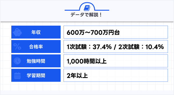 合格体験記や試験範囲の広さからの逆算して、第一次試験対策は500時間、第二次試験対策は1,000時間程度必要とされています。