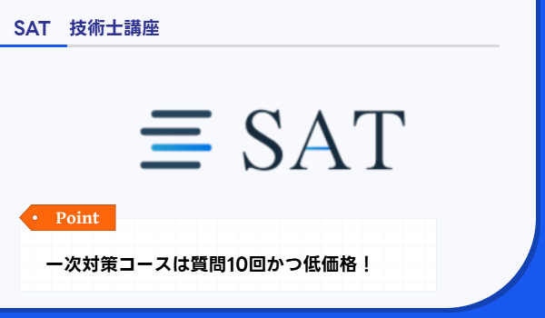 SAT | 一次対策講座が低価格/一般教育訓練給付対象講座あり | 一次/部門別コース: 21,780円 一次/基礎科目・適性科目コース:14,300円 二次/パーフェクト講座(部門別): 141,680円 | 非公開 | メール質問10~30回/添削15回/マンツーマン指導(対象コースあり) | 合格時のお祝いの明示なし/各種割引制度随時案内 | 通信 |