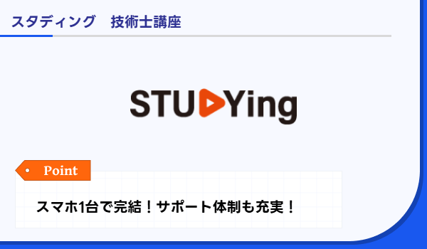 スタディング | スマホ1台で学習完結/サポート体制充実/合格祝い特典あり | 技術士二次試験合格コース:69,300円 | 非公開 | 添削課題/質問カード/口頭試験対策資料/添削オプション | デジタルギフト贈呈(条件あり)/各種割引制度随時案内 | 通信 |