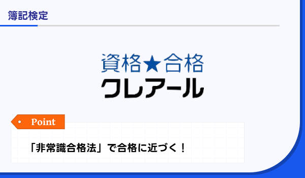 クレアール | 通信特化の時短設計、論点集中カリキュラム | 3・2級講義パックWeb通信:34,000円 | 具体的数値は非公表 | 進捗管理、質問対応(条件あり)、オンライン答練 | 期間割・併用割など(時期により異なる) | 通信のみ |