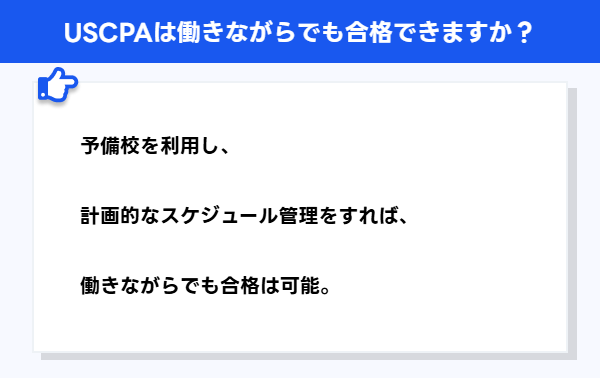 USCPAは4科目を30か月以内に合格すれば良いため、働きながら学習を続ける社会人受験者も多いです。