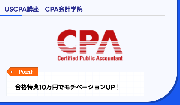 CPA会計学院 | 合格時のキャッシュバック/全国各地の自習室 | U.S.CPA講座:396,000円 | 非公表 | 講師への質問/ライセンス取得支援/全国各地の自習室/提携大学の単位取得等 | 3年以内の全科目合格時「10万円キャッシュバック」/その他割引情報あり | 通信/通学 |