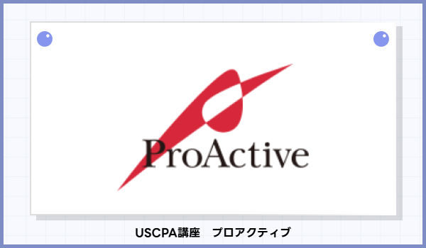 プロアクティブ | 英語で学ぶUSCPA/一般教育訓練給付金対象 | eラーニング:330,000円 通学:396,000円 通信USB:396,000円 | 非公表 | 受験手続案内/質問無制限/カウンセリング/転職・ライセンス取得サポート | 割引情報あり | 通信/通学 |
