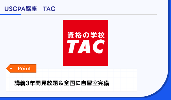 TAC | コスパが良い/全国各地の自習室/一般教育訓練給付金対象 | USCPA総合本科生Plus(Web通信):440,000 USCPA総合本科生(Web通信):430,000 | 非公表 | 質問コーナー/質問E-mail/講師との個別相談 | 紹介割引/学習経験者割引等 | 通信/通学 |
