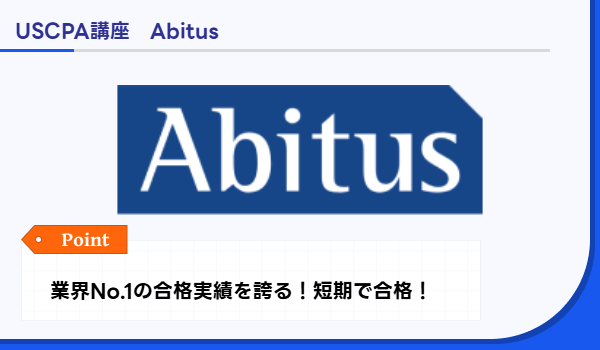 Abitus | 業界No.1実績/最長5年間の学習支援サポート/一般教育訓練給付金対象 | アビタスUSCPAプログラム:624,800円〜 | 累計合格者7,677名(2025年8月末時点) | 無制限質問制度/自習室/受験手続き/ライセンス申請サポート/転職支援 | 割引情報あり | 通信/通学 |