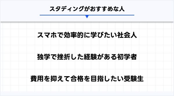 スタディング | 業界内最安級の価格 | 合格コース コンプリート:59,400円 | 受講生合格率非公開 | 問題演習・進捗管理・eラーニング活用 | 期間限定割引・セット割引 | 通信・オンライン |