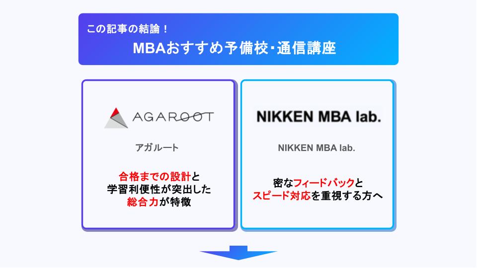 結論、MBAの予備校・通信講座おすすめは「アガルート」と「NIKKEN MBA lab.」です。