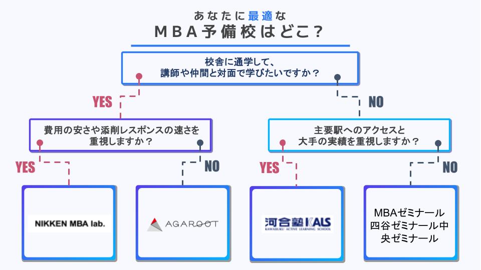 そんな悩みを持つ方のために、30秒であなたに最適なMBA予備校がわかるフローチャートを作成しました。まずは以下のチャートで、自分の重視するスタイルをチェックしてみてください。
