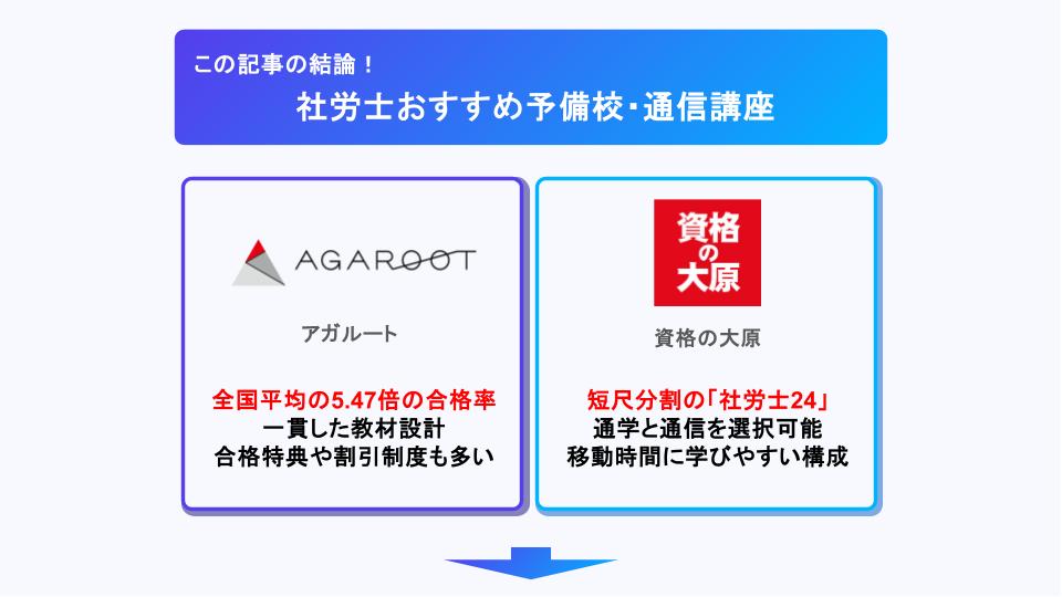 結論、社労士の予備校・通信講座おすすめは「アガルート」と「大原」です。
