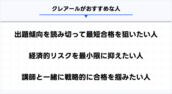 クレアールは、「短期間で確実に合格力をつけたい人」と「費用を抑えつつ安心して継続したい人」の両方に最適な講座です。