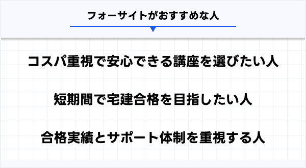 フォーサイトの宅建講座は、合格実績・教材のわかりやすさ・学習効率の3点で高く評価されています。