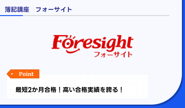 フォーサイトの簿記通信講座は、「最短2か月で合格可能」を掲げつつ、丁寧な教材設計と学習フォロー体制を整えている点が特徴です。