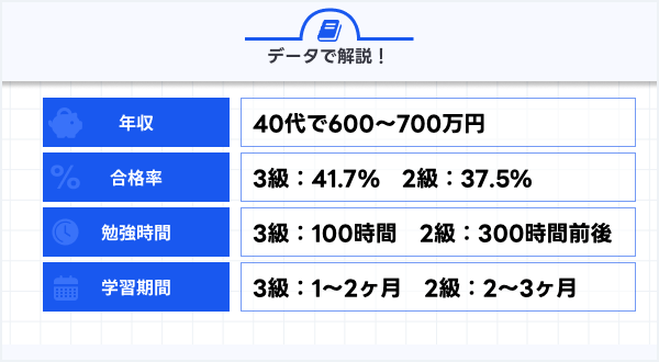 直近の合格率は、3級が41.7%、2級が37.5%です。