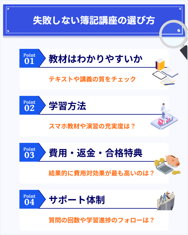 簿記講座を選ぶ際は、教材の分かりやすさ・学習スタイルとの相性・サポート体制のポイントを重視することが合格への近道です。