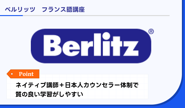 ベルリッツ | ネイティブ講師×日本カウンセラー体制で学習しやすい | 月額18,975~ | レッスン満足度98.6% 世界20,000社、国内5,500社以上がベルリッツのプログラムを導入 | ・日本人カウンセラー+ネイティブ講師 ・学習進捗可視化 ・24時間サポートあり | 入会金無料など時期キャンペーンあり | 通信・通学両対応 |