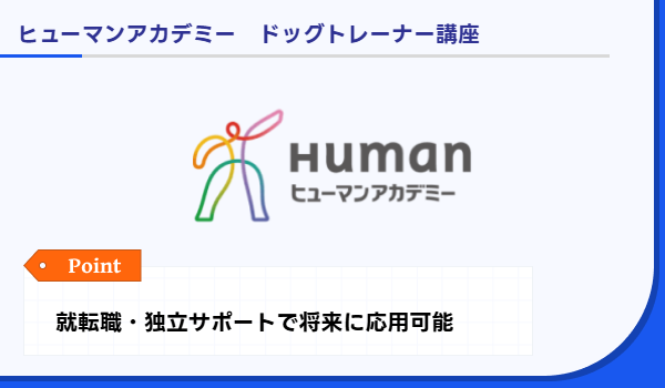 ヒューマンアカデミーのドッグトレーナー講座は、初心者でも「犬のしつけ」「トレーニング理論」「ペットロスケア」など幅広いテーマを学び、自宅受講だけで複数ライセンス取得を目指せるのが特徴です。