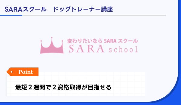 短期間で2資格取得できコスパの高いSARAスクール、就転職まで視野に入れられるヒューマンアカデミー、短期集中で合格まで導く日本ドッグトレーナー協会など、それぞれに強みがあります。