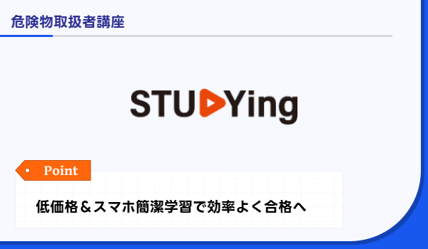 スタディングの危険物取扱者講座は、忙しい社会人でも継続しやすく、スマホ一台で場所を選ばず学習でき、10分前後の短い動画でスキマ時間に取り組みやすい点が高く評価されています。