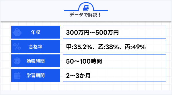 甲種の合格率は35.2%、乙種の合格率は約38%、丙種は約49%と、受験資格や難易度により差があります。