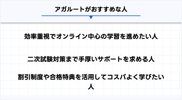 アガルートは、スキマ時間で効率よく学びたい人に最適な講座です。