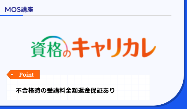 キャリカレ | 不合格時の全額返金保証付きで安心感が高い | MOS Word 合格指導講座【学習サポート期間1年間】:39,800円(Web申込) MOS Excel 合格指導講座【学習サポート期間1年間】:39,800円(Web申込) | 具体的な数値は非公表 | 無制限質問、添削指導、就職サポートなど手厚い | 合格保証(条件付き全額返金)、Web申込割引 | 通信 |