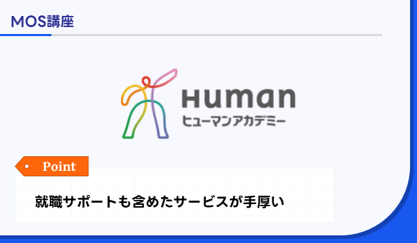 ヒューマンアカデミー | プロ講師の指導と就職支援をセットで受けられる | 入学金:55,000円 MOS Excel 2019 資格対策コース:18,000円 MOS Word 2019 資格対策コース:20,400円 | MOS試験合格者は16,000名以上 | 質問対応、キャリアカウンセリング、就職支援あり | 時期により入学金割引やキャンペーンあり | 通信+通学 |