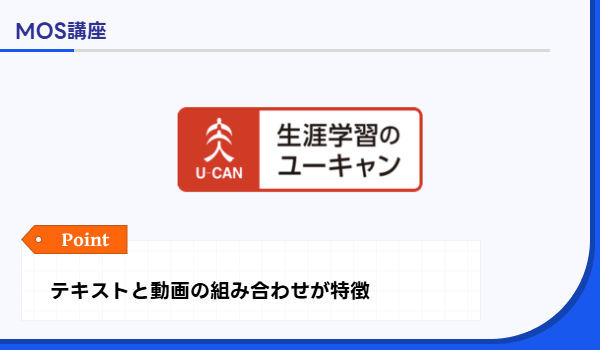 ユーキャン | 初心者向けにバランスの良い教材+動画で学びやすい | 【MOS 365】一般・上級一貫 Word&Excel両方コース:49,000円 | 具体的な数値は非公表 | 質問OK(1日上限あり)、学習スケジュール例などでサポート | 返品制度や時期によるキャンペーンあり | 通信 |
