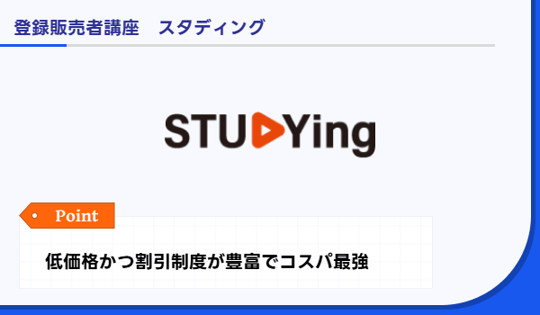 スタディング | スマホ完結・低価格でスキマ時間学習に強い | 【登録販売者合格コース】 2026年度試験対応:29,800円 2025年度試験対応:20,860円 | 合格率非公表、口コミ評価中心 | 学習Q&A(質問チケット制)、AI学習管理 | 学割・期間限定割引あり | 通信 |