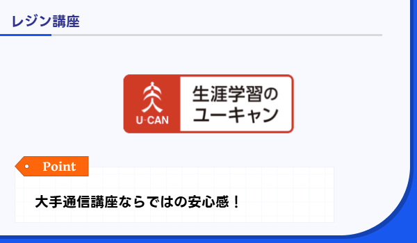 ユーキャンは、教材一式が揃っていて初心者でもすぐ始めやすい点や、期限が1年と長くマイペースで進められる点が評価されています。