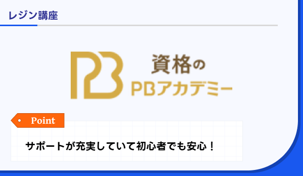PBアカデミー | 初心者でも資格取得まで到達できる実践重視カリキュラム | 税込81,400円 | 修了・認定実績多数(具体数非公開) | 質問無制限/受講期間延長制度あり | 資料請求割引・期間限定キャンペーン | 通信 |