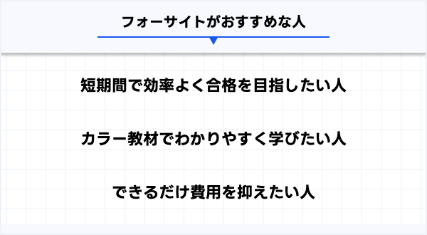 費用をできるだけ抑えつつ、合格に必要な教材をそろえたい人には合いやすいと言えます。まずは手頃に始めたい人にとって安心材料になりやすいでしょう。